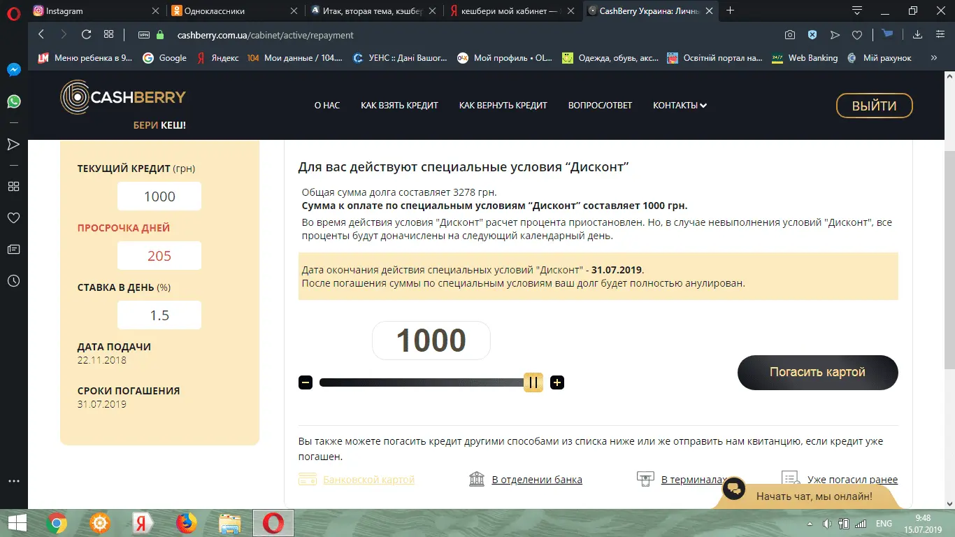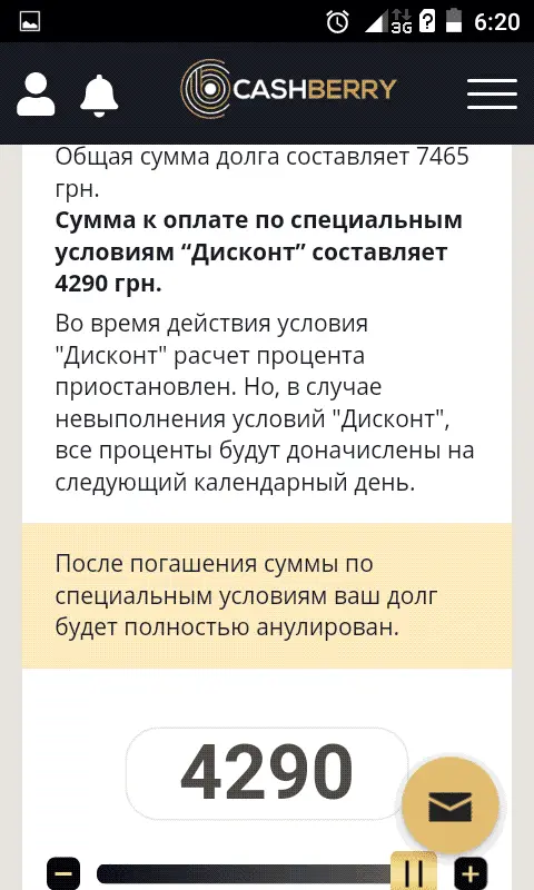 Мені надали 2дні 6000---17880----6000. Питання ,нафіга так людей гнобити,щоб потім те саме заплатити?Сейчас заглянула тоже. У меня тоже дисконт. Брала 3300. Предлагают отдать 4290. Буду закрывать)))