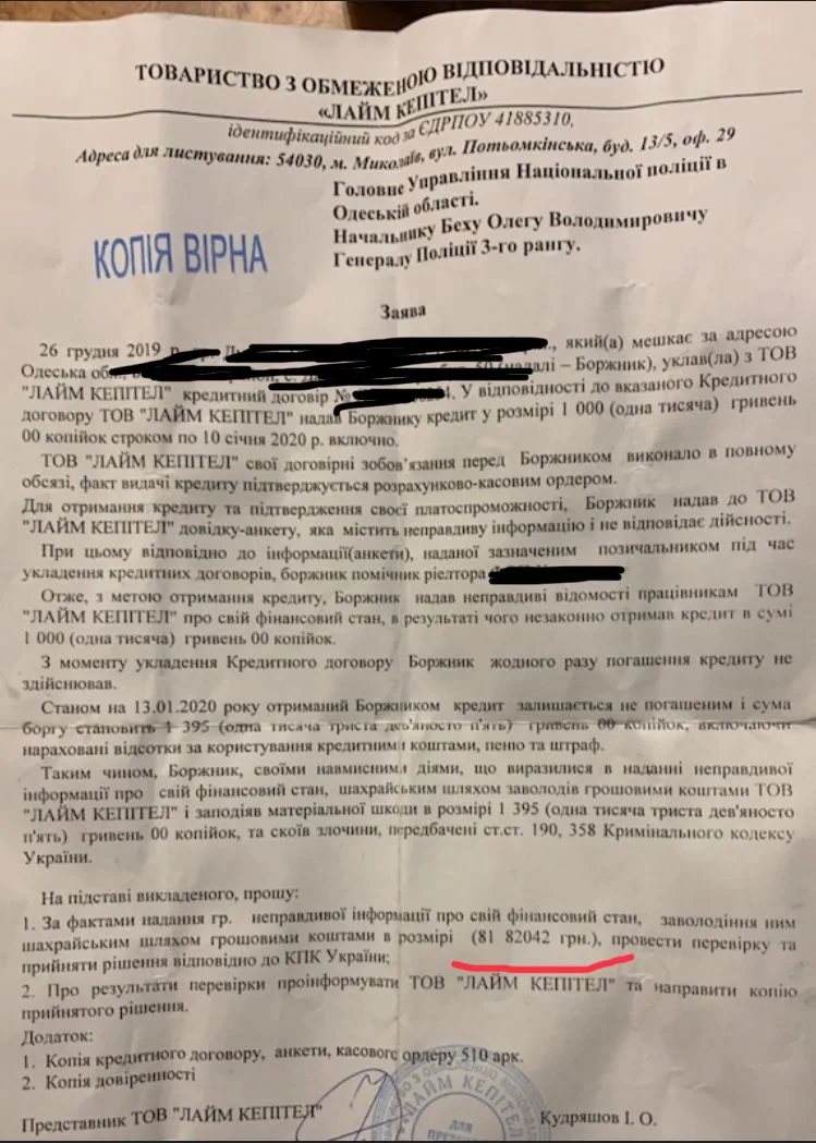 Прошу совета у тех кто сталкивался. Пришло такое письмо в сельский совет. Путём поиска на форуме выяснила, что «лайм капитал» это готивочка. Сложилось впечатление, что это липа, хотя проверили нацполицию, есть там такой руководящий. Возможно это просто запугивание? Так же интересует мнение о сумме в конце(отмечено красным), тоже взятой из потолка при теле в 1000