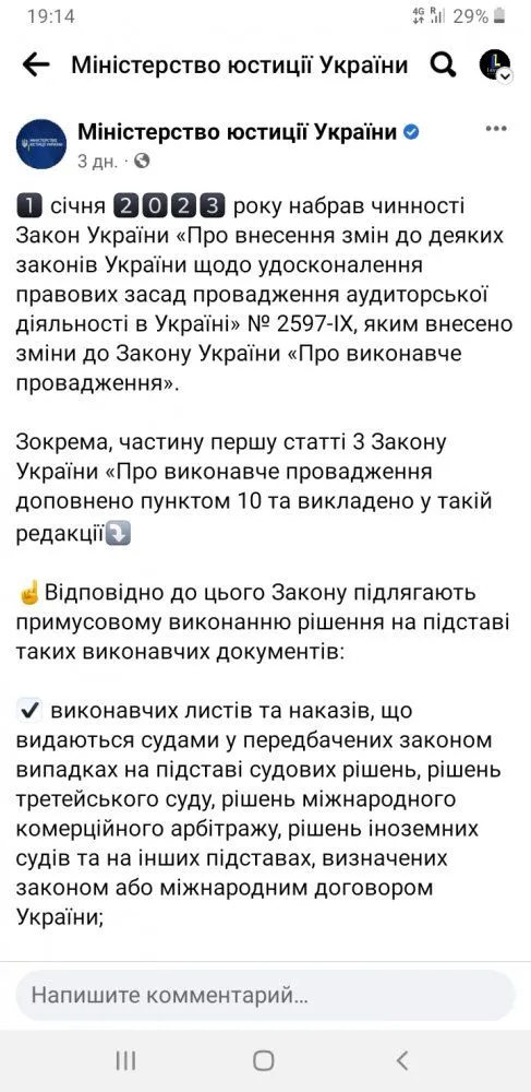 Починаючи з нового року, в Україні набув чинності Закон України «Про внесення змін до деяких законів України щодо удосконалення правових засад провадження аудиторської діяльності в Україні» № 2597-IX, яким внесено зміни до Закону України «Про виконавче провадження».